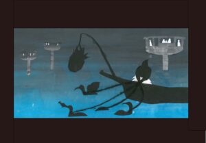 白河氏「影絵のような大胆さが心地よい。水面のブルーとグレーのグラデーションが鵜飼の緊張感を際立たせている。」